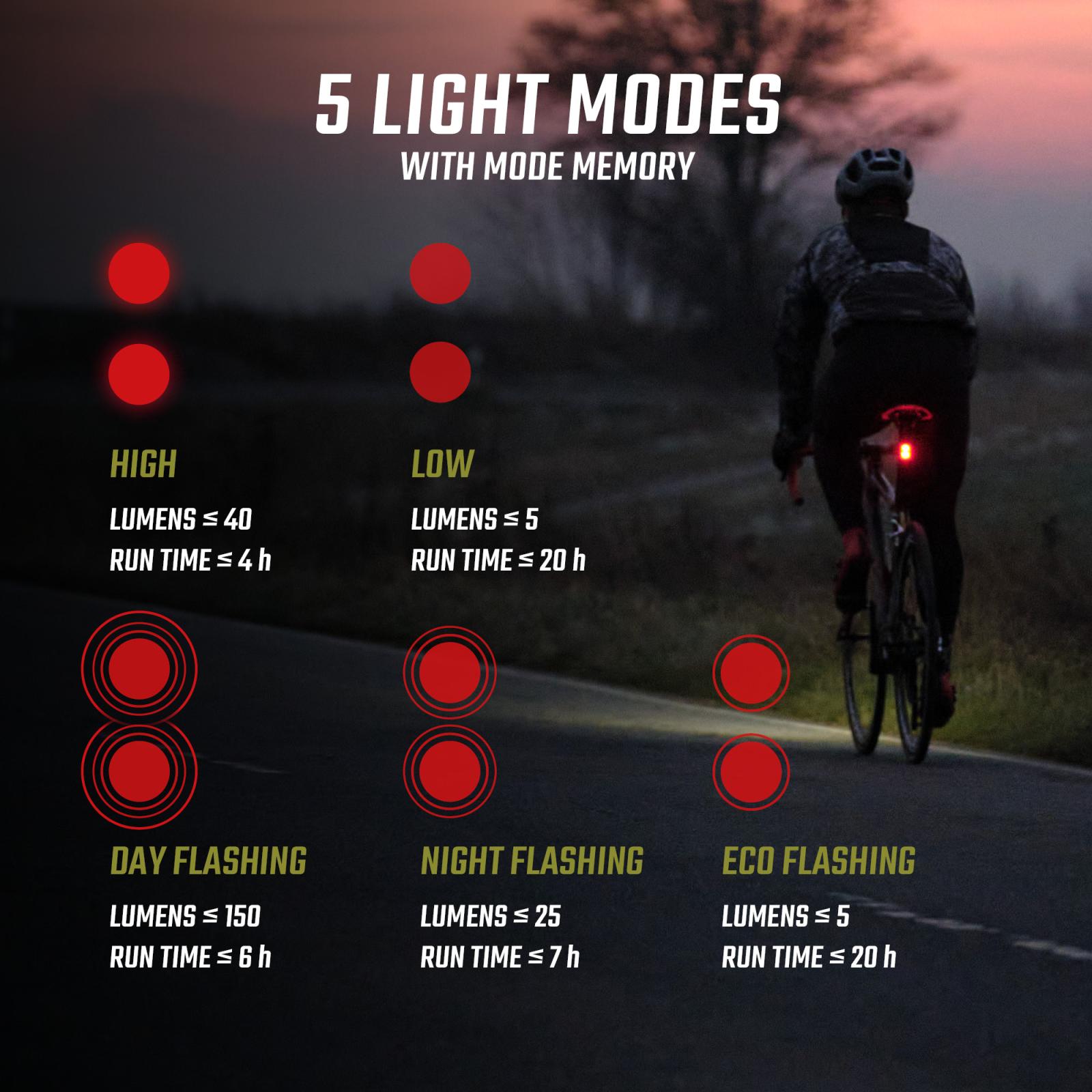 Bis zu 150 Lumen, 2000 Meter Sichtbarkeit, Bremslichtfunktion und fünf Lichtmodi für Tag und Nacht