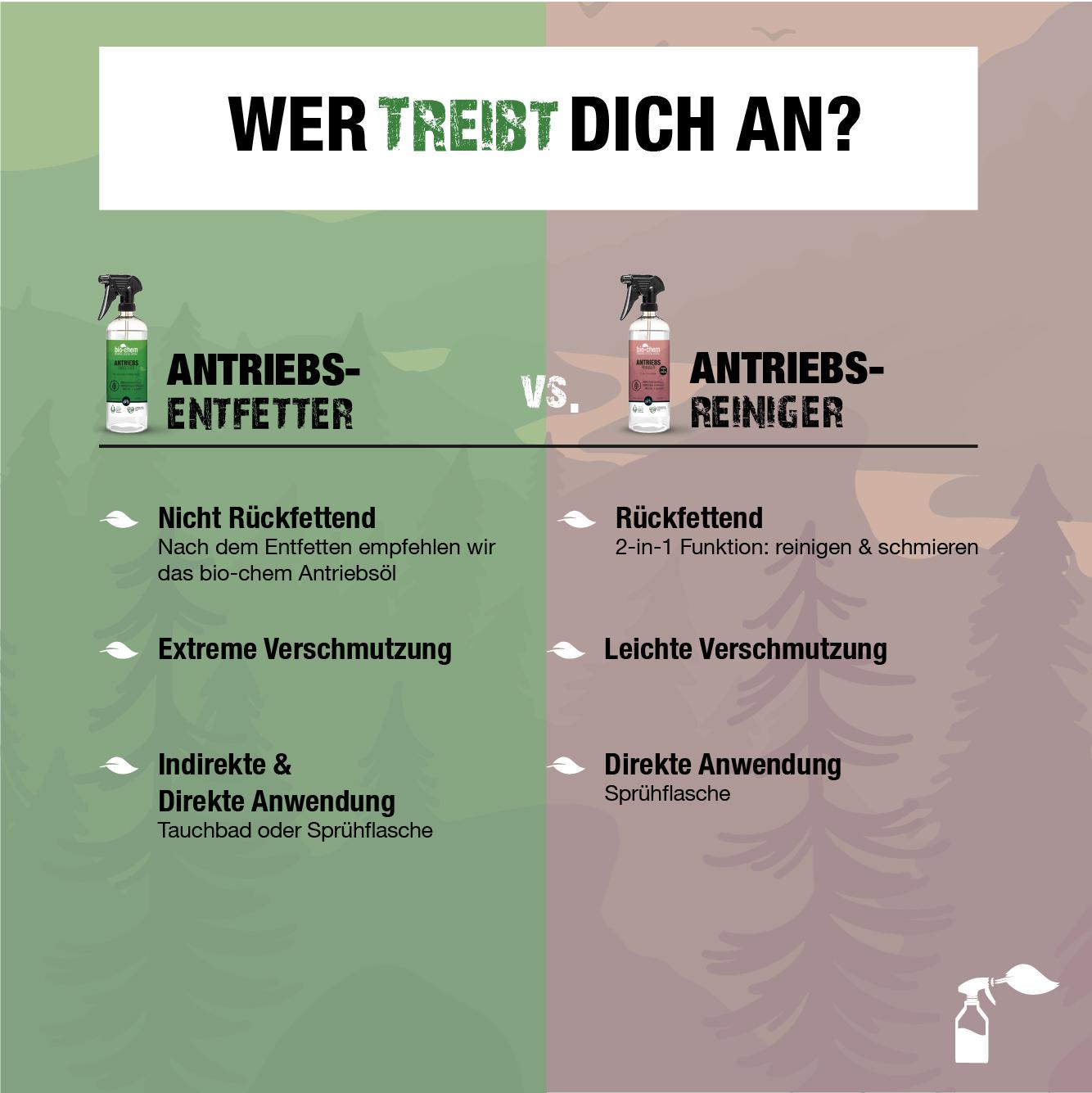 Freunde des aktiven Radsports aufgepasst! Vorbei mit zeitaufwendigem und nervigem Reinigen und Schmieren der Fahrradkette! Mit dem bio-chem Antriebsreiniger reinigst und schmierst du deine Fahrradkette und das Kettenritzel in einem Schritt umweltfreundlich und effizient. Das Mittel riecht dabei nicht streng und ist natürlich kein bisschen aggressiv so wie es viele herkömmliche Kettenreiniger sind. Trotzdem ist der bio-chem Antriebsreiniger extrem wirkungsvoll und auch auf Aluminium bedenkenlos verträglich.
